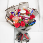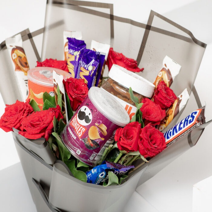 باقة جريئة ورومانسية تضم زهورًا حمراء نابضة بالحياة، وشوكولاتة فاخرة، وعلبة برينجلز المفضلة لدى الجميع، ملفوفة بورق أسود أنيق. تجمع هذه الباقة الفريدة بين الأناقة والمرح، وهي مثالية للتعبير عن الحب أو التقدير أو الاحتفال. سواء كانت مفاجأة لشخص مميز أو لحظة تدليل للنفس، فإن هذه الباقة تقدم الجمال والدلال في حزمة واحدة رائعة.