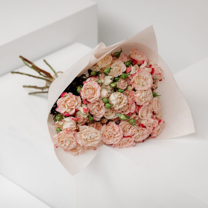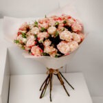 نقدم لكم أزهارنا الوردية الساحرة مع اللف الوردية – احتفال رائع بالأنوثة والرقة. تم ترتيب هذه الزهور الوردية الرائعة بعناية لتشكيل جمالية ناعمة ورومانسية تجسد الجمال والأناقة. تم اختيار كل زهرة بعناية من أجل لونها الزاهي وملمسها الرقيق، مما يؤدي إلى عرض مذهل يلتقط جوهر سحر الطبيعة.