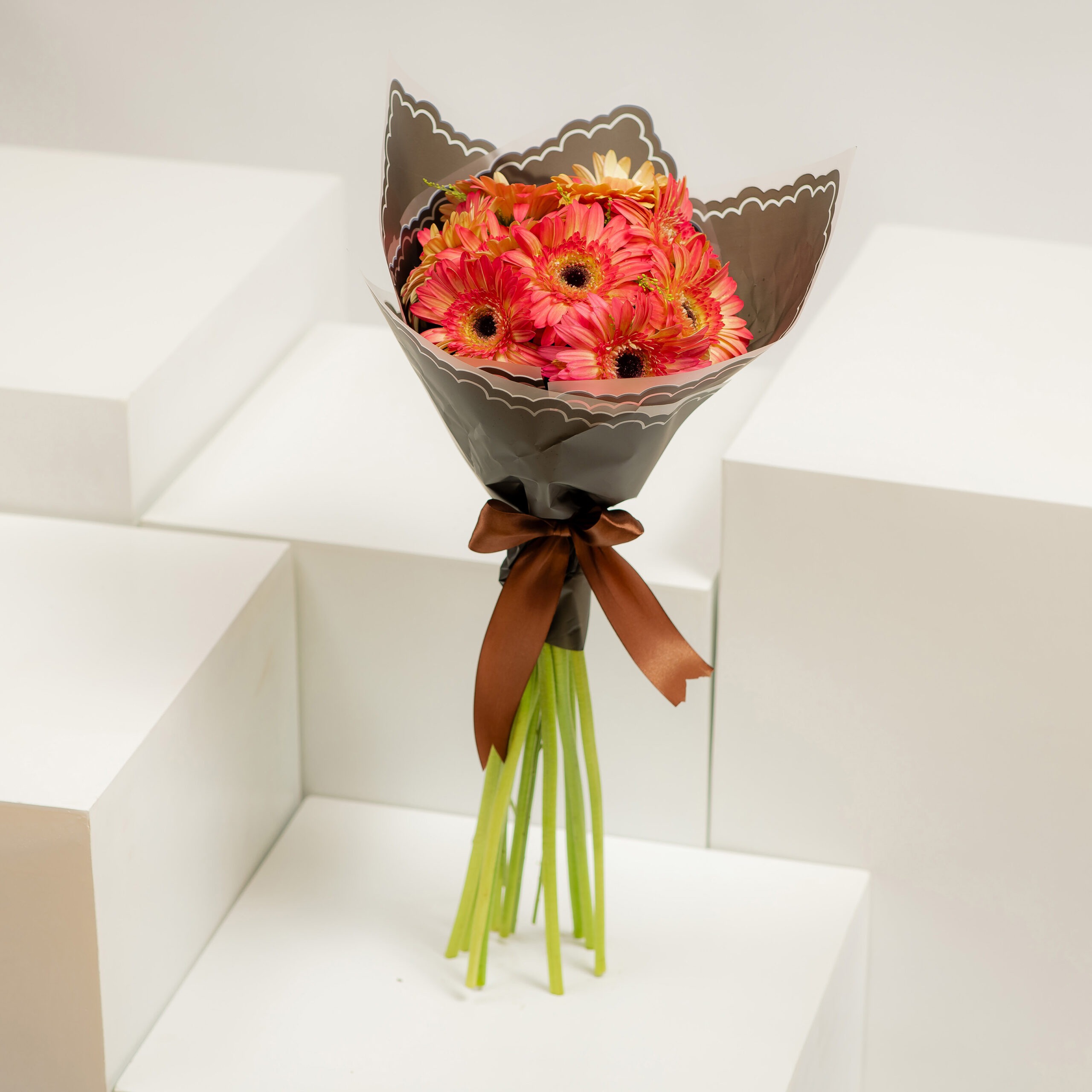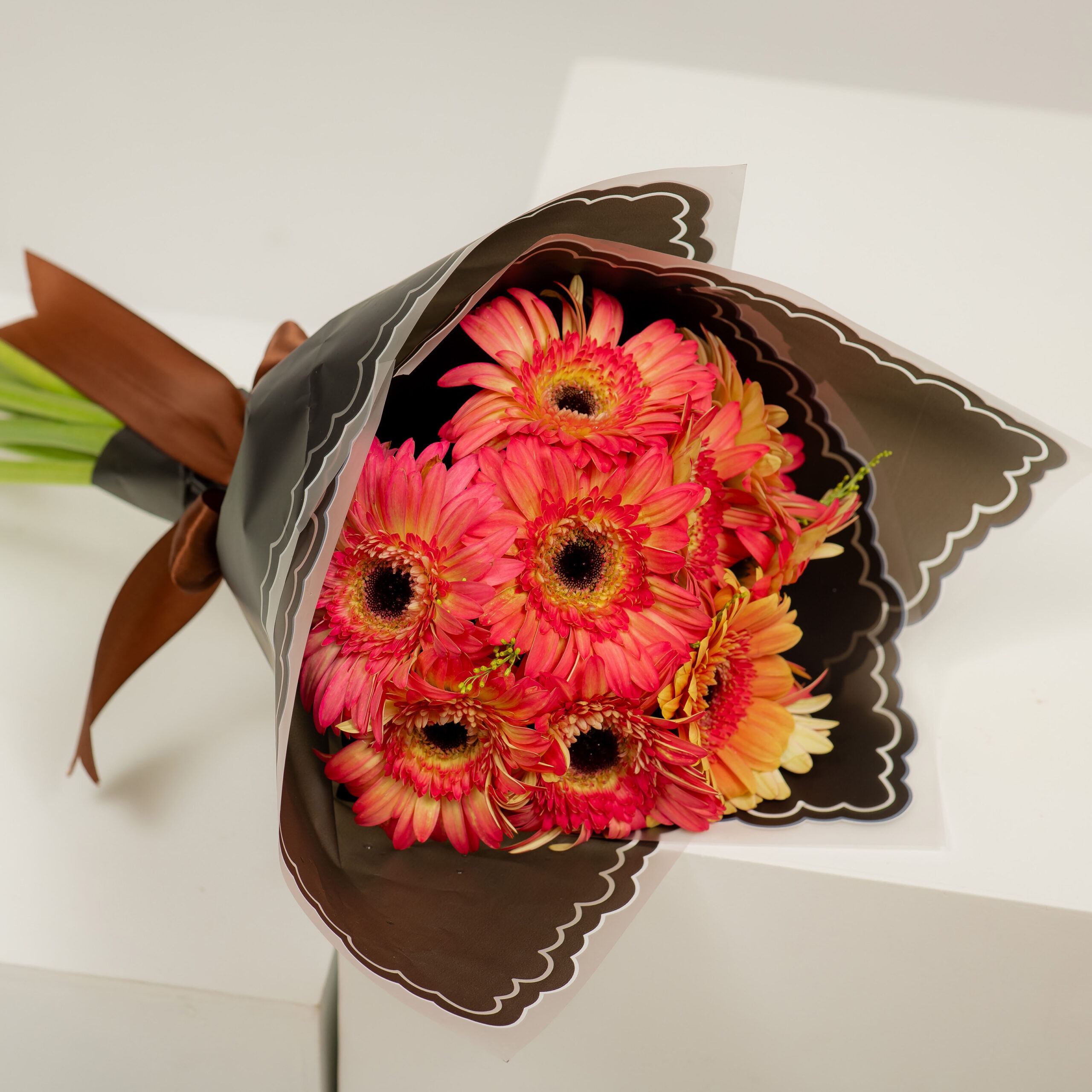تخلق زهرة الجربيرا البرتقالية النابضة بالحياة، الملفوفة في تغليف أسود أنيق، تباينًا لافتًا يعزز من ألوانها الزاهية والدافئة. تعكس بتلات الجربيرا البرتقالية العميقة طاقة وحيوية، بينما يضيف التغليف الأسود لمسة من الأناقة والرقي. يجمع هذا المزيج بين الألوان الزاهية والتقديم العصري ليجعلها اختيارًا مثاليًا لترتيب زهور عصري وأنيق، يناسب أي مناسبة تتطلب جمالًا وتأثيرًا.