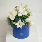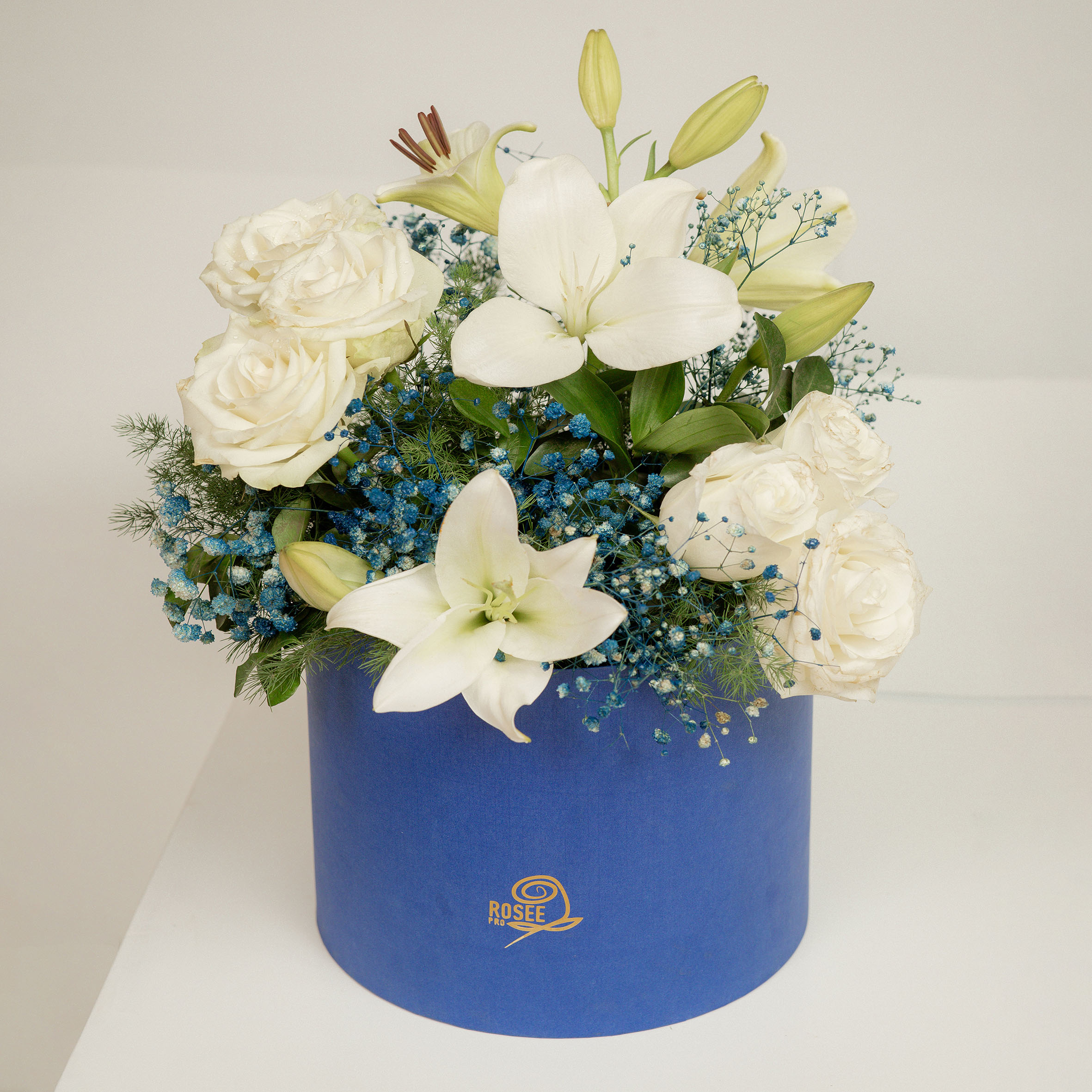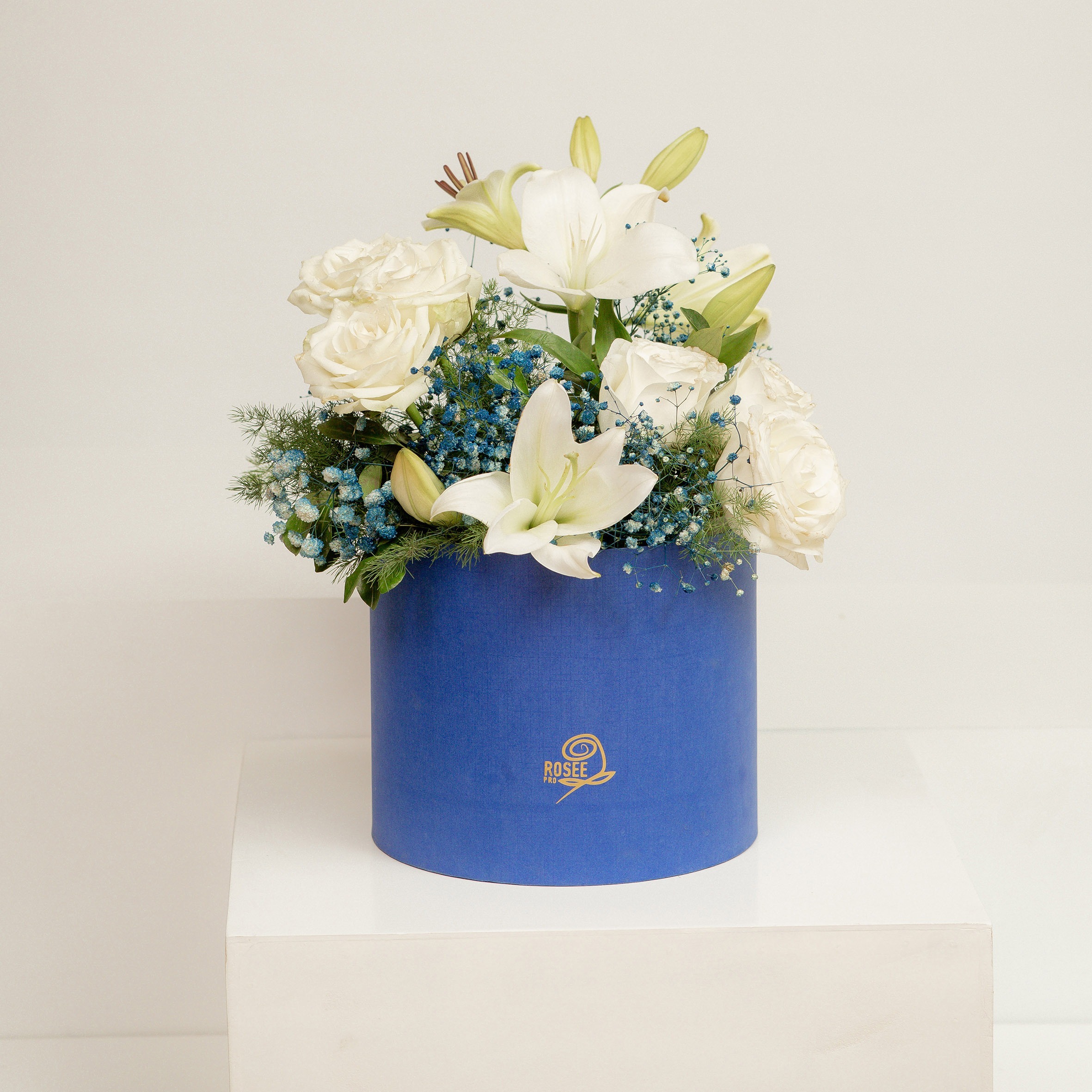 يتميز بوكس الزهور بباقة رائعة من الزهور البيضاء الناصعة التي تبرزها الزنابق الأنيقة العطرة. اختيرت كل زهرة بعناية فائقة لتظهر بتلاتها الرقيقة وتباين ألوانها الرقيقة من العاج الكريمي إلى الأبيض النقي. تُضفي الزنابق بسيقانها الطويلة الرشيقة وأزهارها ذات الشكل النجمي عنصر الرقي والسحر على المجموعة. صُممت الباقة في صندوق أنيق وعصري يُكمل جمال الزهور ويُضفي لمسة من الأناقة. تُضفي النباتات الخضراء الناعمة تبايناً منعشاً مع البتلات البيضاء مما يضفي لمسة جمالية هادئة ومهدئة مثالية لأي مناسبة. سواء قُدمت كهدية مدروسة أو استُخدمت كقطعة مركزية مذهلة، فإن هذا الصندوق من الزهور البيضاء والزنابق البيضاء ينضح بالنقاء والنعومة.