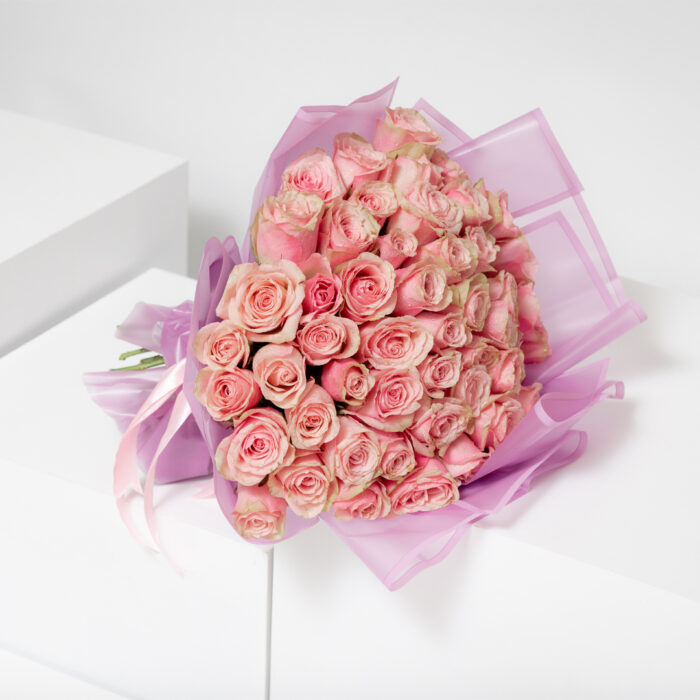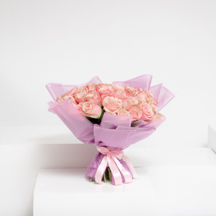 باقة أنيقة من الورود الوردية الناعمة، ملفوفة بورق بنفسجي فاتح، تجمع بين الرومانسية الهادئة ولمسة من الأناقة الحالمة — الهدية المثالية للتعبير عن الحب أو الإعجاب أو المشاعر الرقيقة.