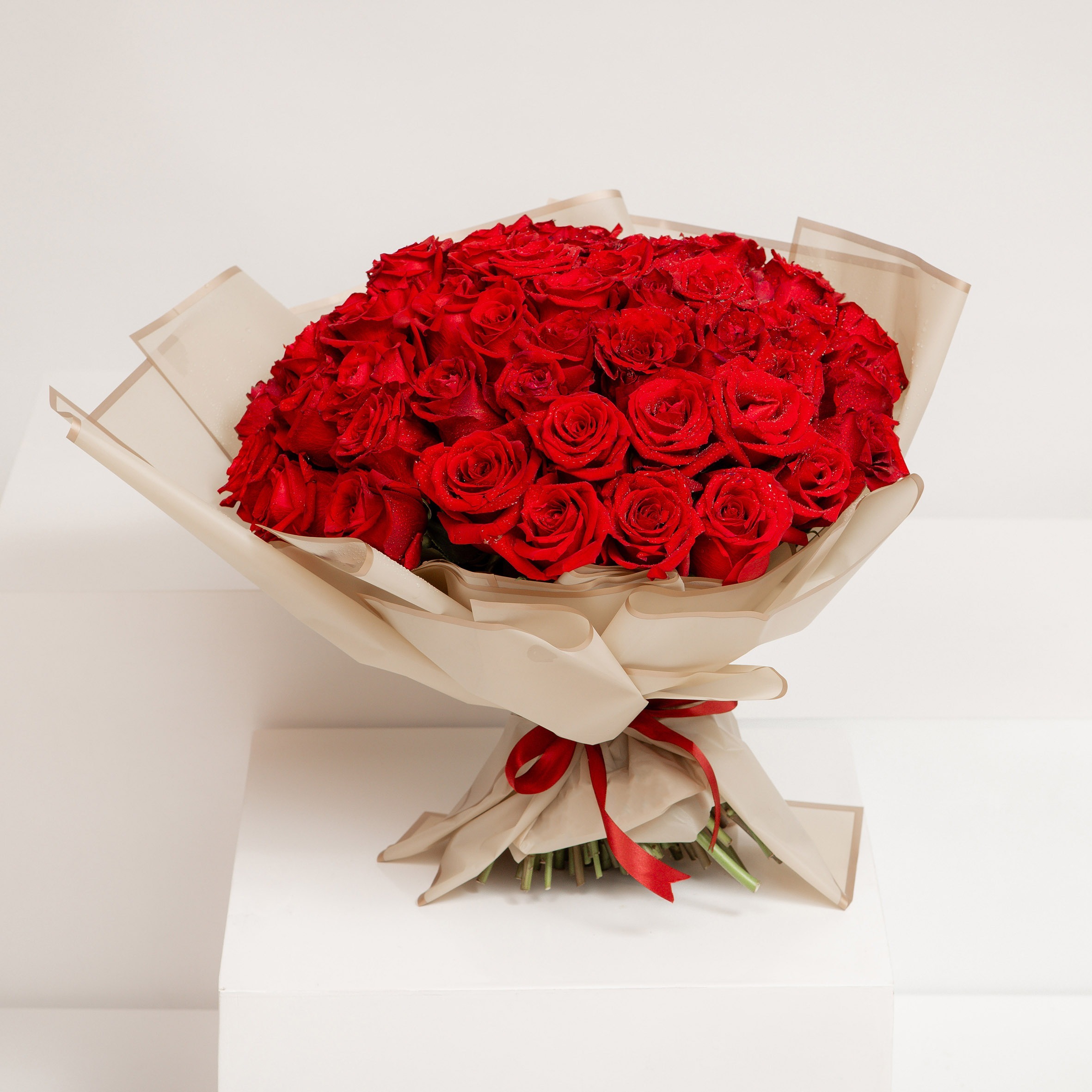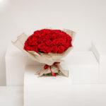 باقة رائعة من الزهور الحمراء الجريئة، ملفوفة بورق بيج ناعم، تجمع بين الشغف والأناقة بتصميم كلاسيكي — مثالية لتقديم رسالة مؤثرة ومميزة من القلب.