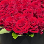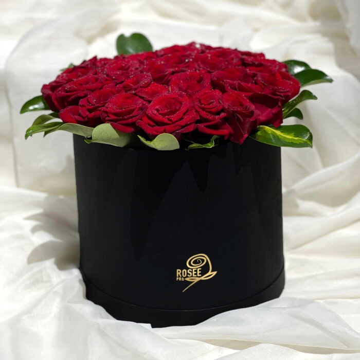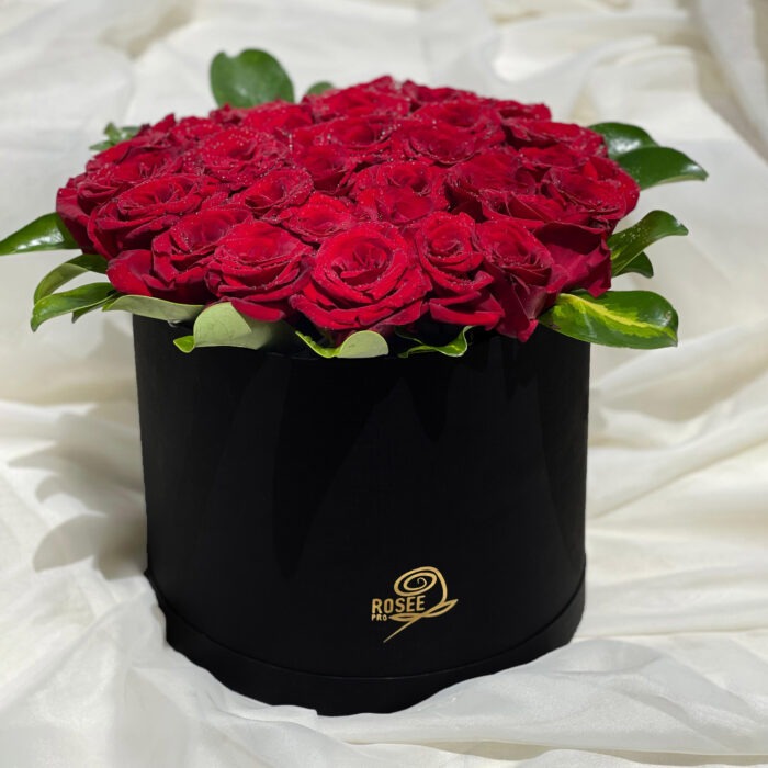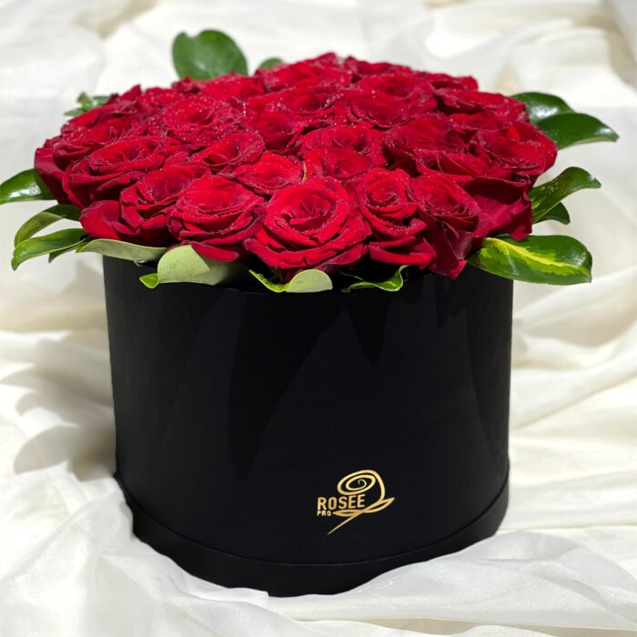 صندوق زهور دائرية سوداء عالية الجودة من الورق المقوى الدائري الأسود تتميز بباقة مذهلة من الورود المصرية الحمراء التي تأسر بجمالها الساحر. تحيط بالورود نباتات خضراء مورقة تشبه أوراق الشجر، مما يضفي لمسة من الطبيعة والحيوية على الباقة. هذا التصميم الأنيق يجعل من الصندوق قطعة مميزة وفاخرة تلفت الأنظار وتدخل البهجة على القلوب.