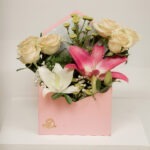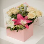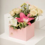 صندوق كرتوني وردي عالي الجودة، مصمم خصيصًا للزهور، يتميز بتصميم رائع وجذاب، بتوازن مثالي بين الألوان والزهور. يحتوي على تشكيلة من الزهور، منها ورود كينية كريمية اللون، وأقحوانات خضراء، وزهرتي زنبق، إحداهما بيضاء والأخرى وردية، مع لمسة من الزهور الصغيرة. يجسد هذا الصندوق الجمال والأناقة، ما يجعله الهدية المثالية لأي مناسبة خاصة أو لمن يرغب بإضافة لمسة من السحر والجمال إلى حياة أحبائه.