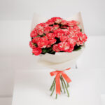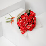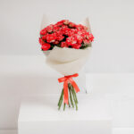 This vibrant bouquet features a collection of rich red spray flowers, each bloom symbolizing passion and energy. The small, clustered flowers come together in a stunning arrangement, creating a sense of warmth and charm. Wrapped in a classic white linen, the bouquet exudes a timeless, rustic elegance. The soft texture of the linen perfectly complements the boldness of the red flowers, making this bouquet an ideal choice for any occasion that calls for a touch of sophistication and love.