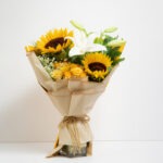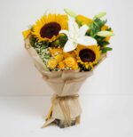 A radiant bouquet of sunflowers and elegant lilies wrapped in soft beige paper, combining warmth, purity, and natural beauty — a perfect gift to brighten any moment with grace and charm.