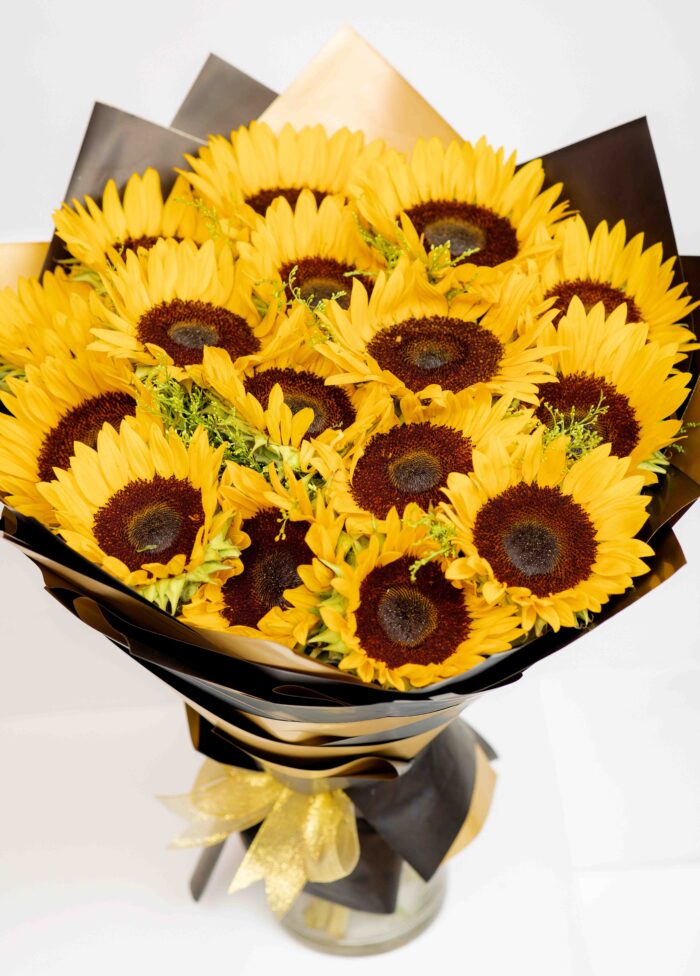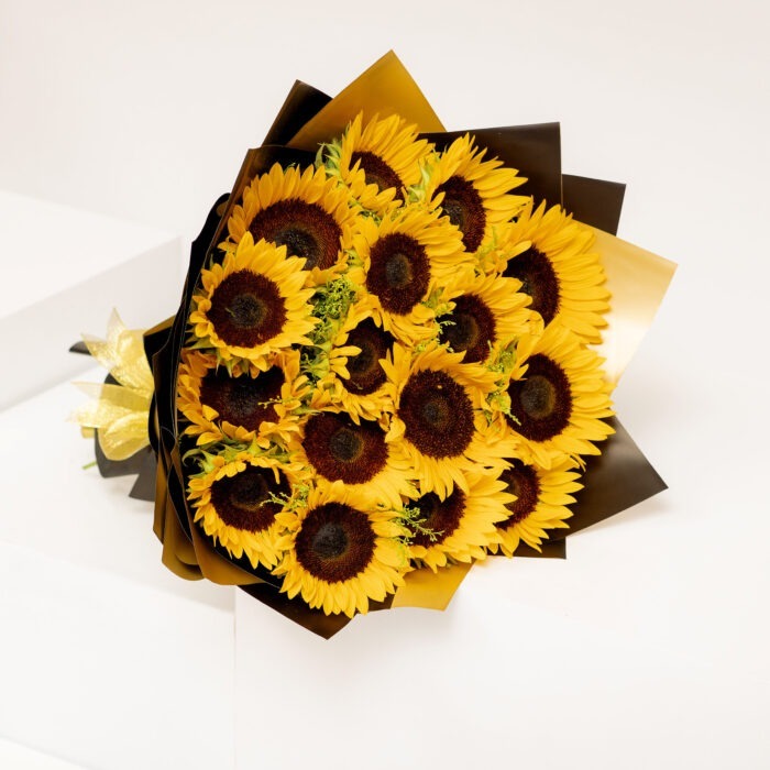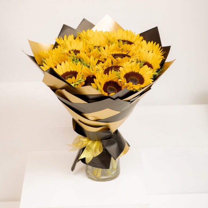 A bouquet of radiant sunflowers wrapped in elegant black and gold paper, blending simplicity and luxury for a perfect gift that shines with warmth and charm.