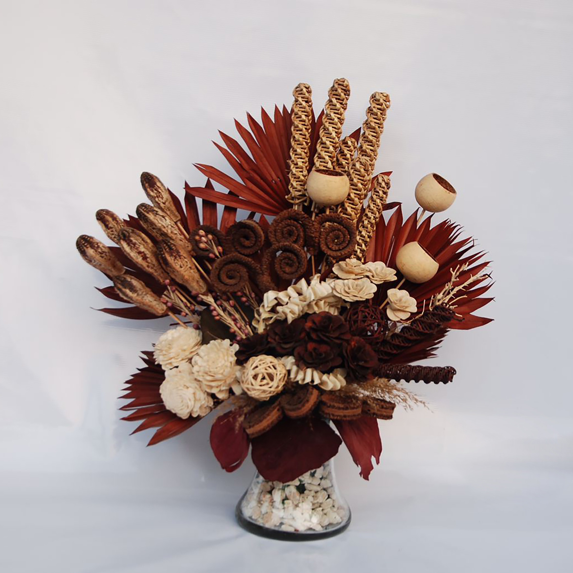 A colorful dried flower arrangement in an elegant vase adds a cheerful and artistic touch to any space. The carefully selected blend of red, yellow, and purple creates a vibrant and attractive display. Dried flowers retain their beauty over time, providing a lasting burst of color without the need for maintenance. Paired with a modern and elegant vase, this arrangement is perfect for adding a pop of color to your home, office, or anywhere that needs a touch of natural charm. Ideal for those who appreciate the beauty of nature and want to add a durable and easy-to-maintain decorative element to their decor.