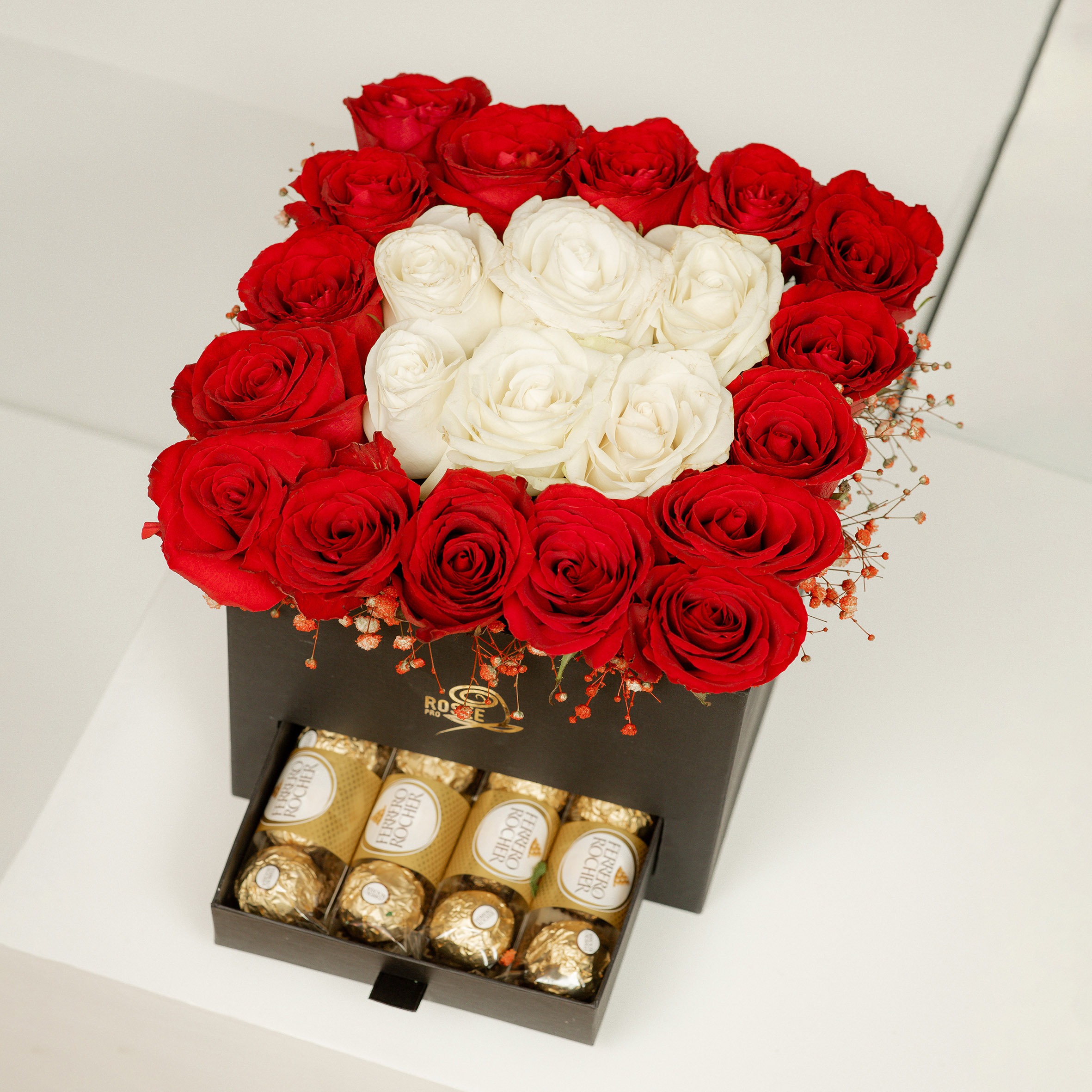 This elegant black box is beautifully adorned with vibrant red and white flowers, creating a striking contrast against its sleek, dark exterior. Inside, nestled within the luxurious packaging, are Ferrero Rocher chocolates, known for their indulgent combination of a crunchy hazelnut center, creamy chocolate, and golden, textured shell. The exquisite blend of floral design and the rich, velvety chocolate makes this gift a perfect symbol of sophistication and sweetness.